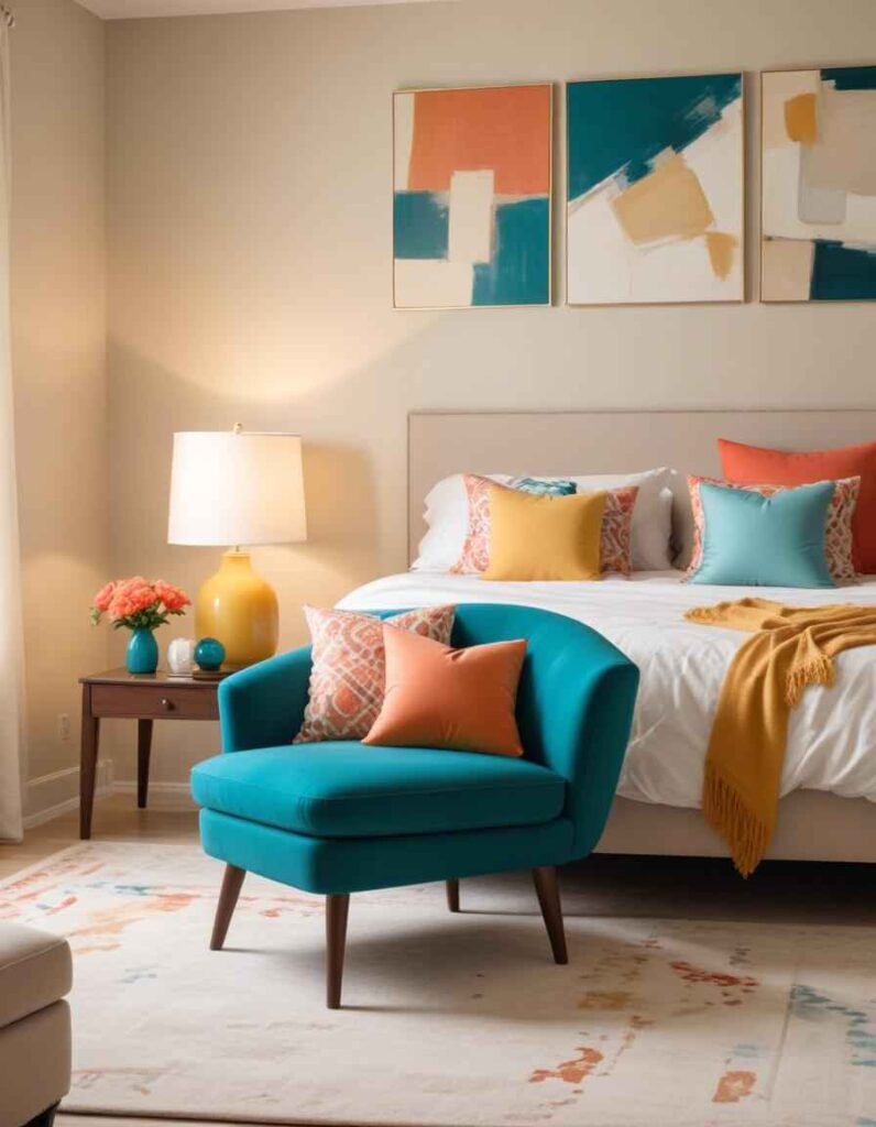 Try a teal velvet armchair for a luxe touch, a mustard throw draped across the bed, or a coral lamp on your nightstand for a playful twist.
