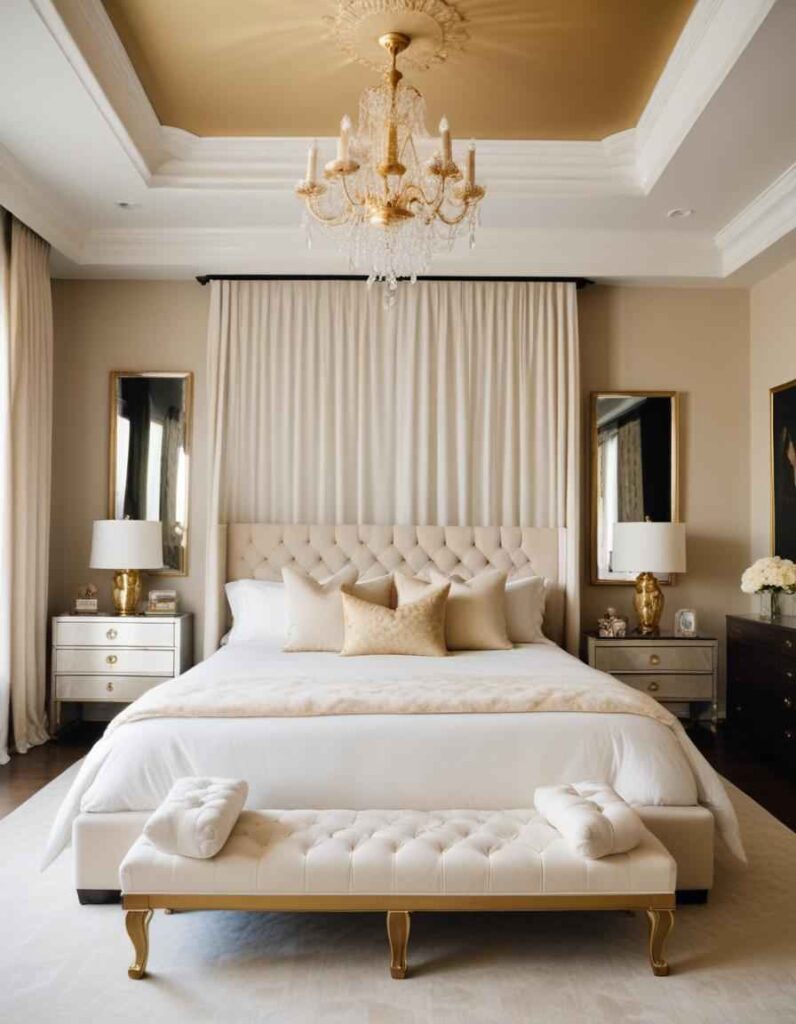 Start with crisp, high-quality bedding, plenty of plush pillows, and a tufted headboard to anchor the space. A statement chandelier instantly adds drama, while mirrored nightstands or dressers bring a touch of glam.